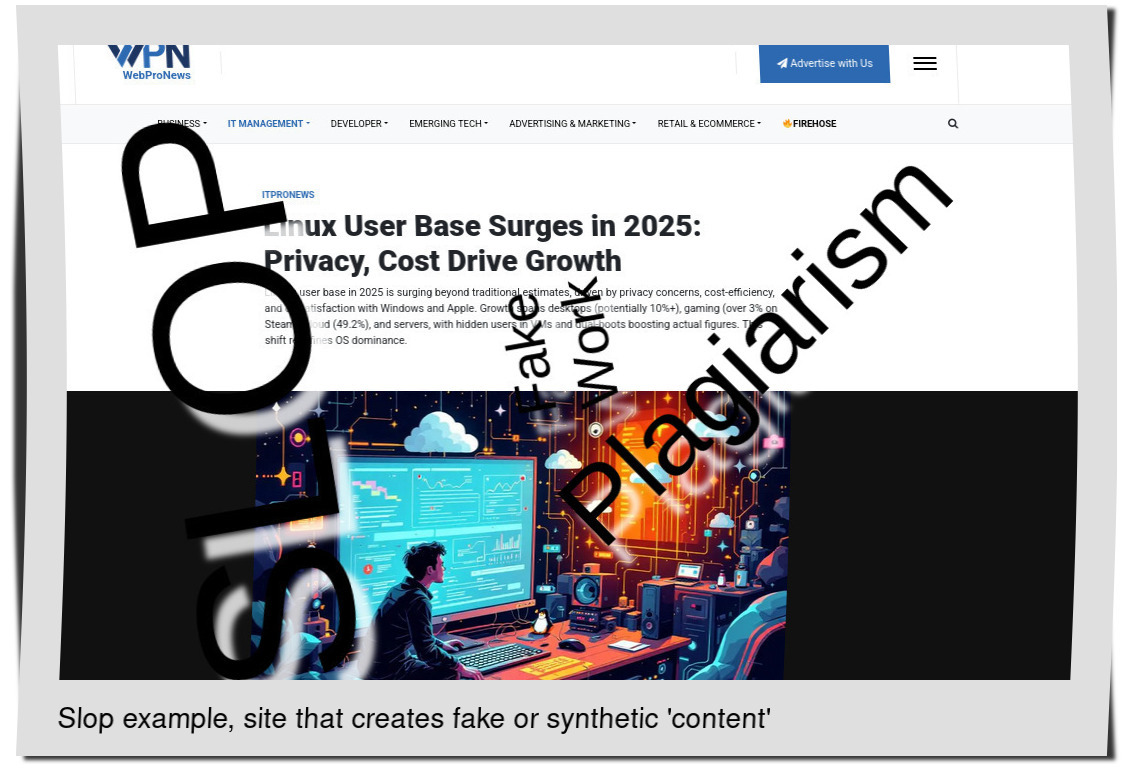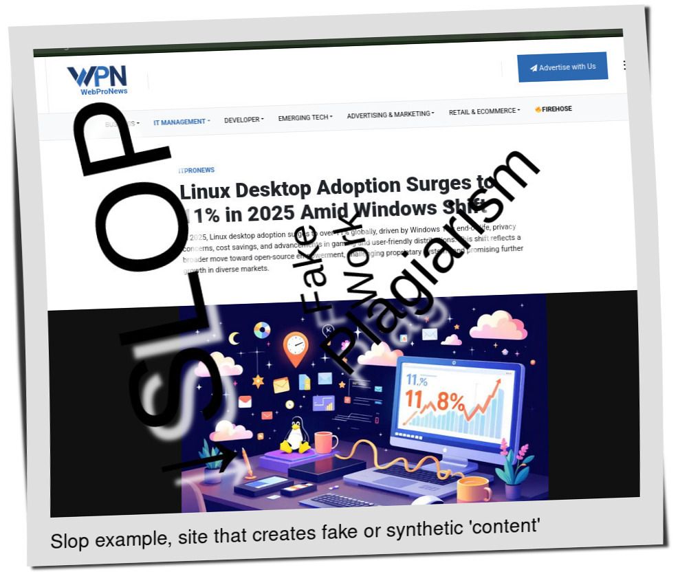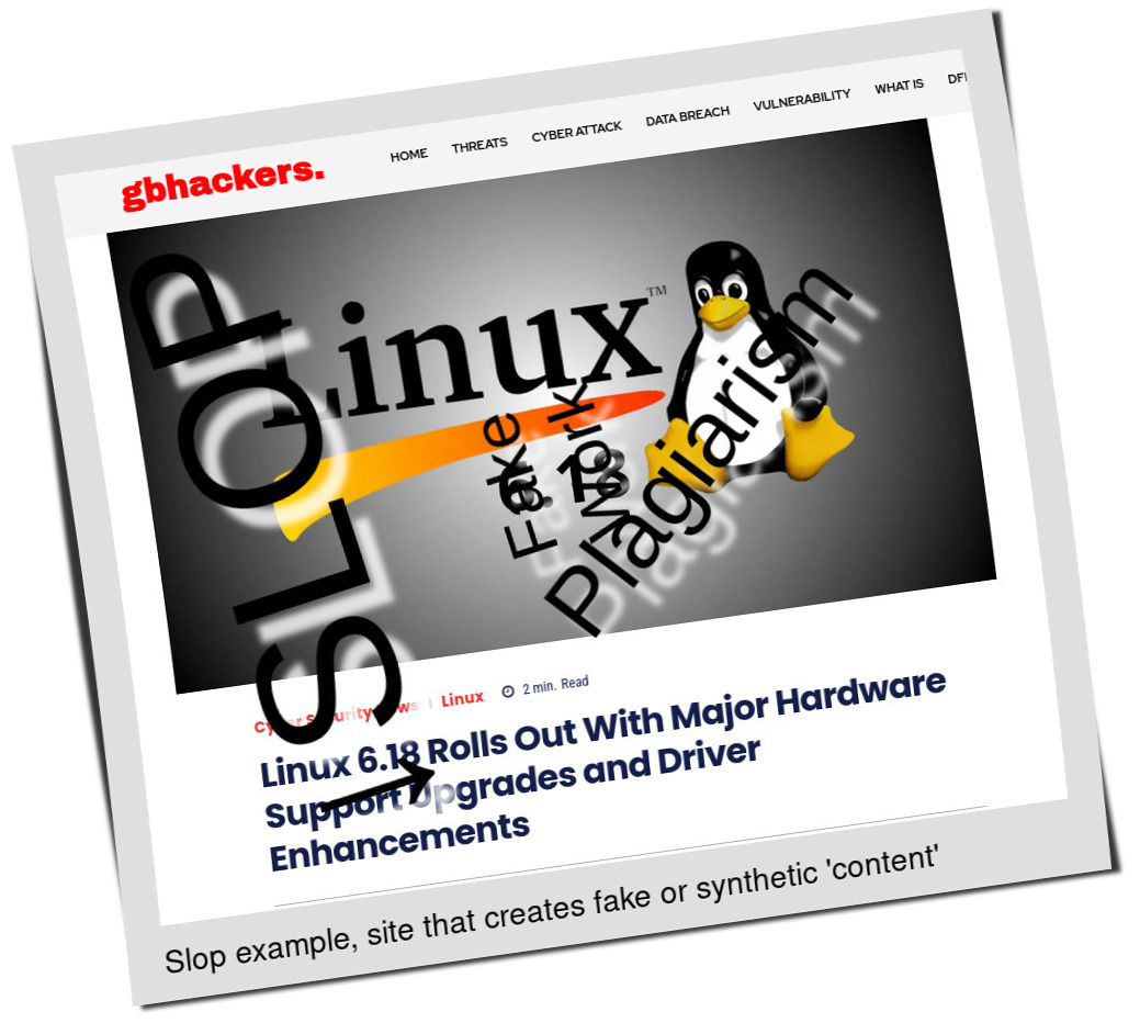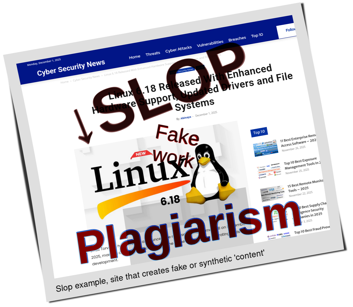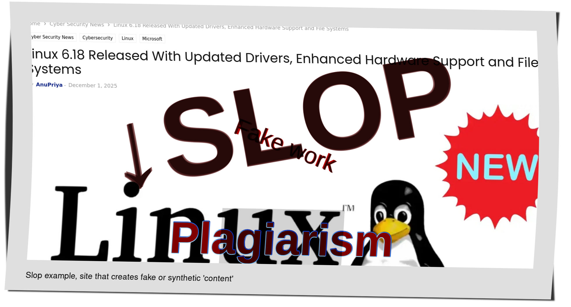 After some cautious optimism (this morning) we've once again checked Google News. We did that a few moments ago, only to find a triplet of slopfarms that infest Google News and all got promoted by it earlier today. They're trying to override originals about a new release of Linux using SEO by slop, permutation, and fake images: