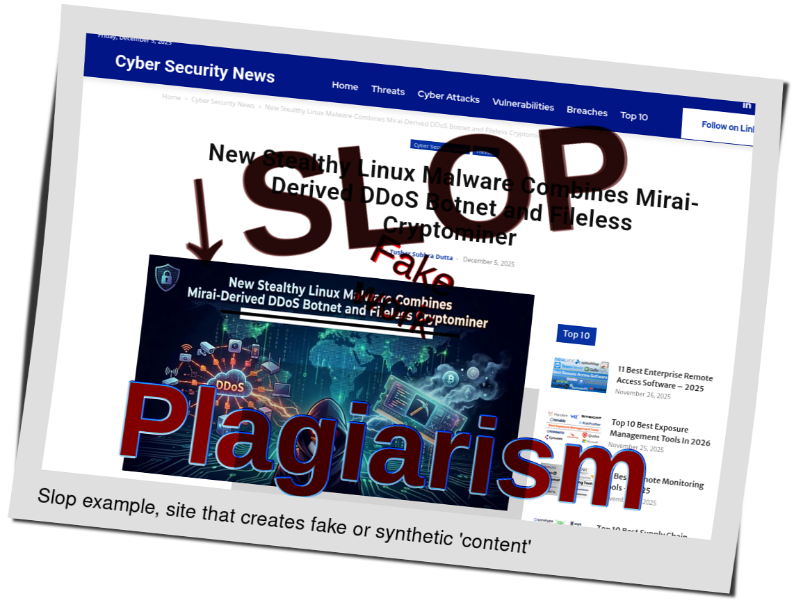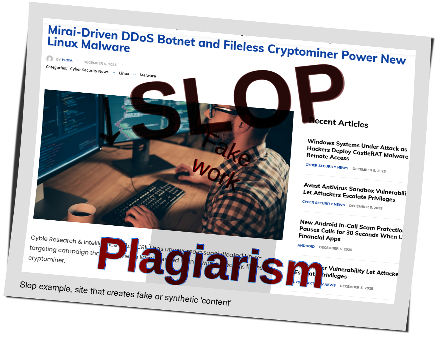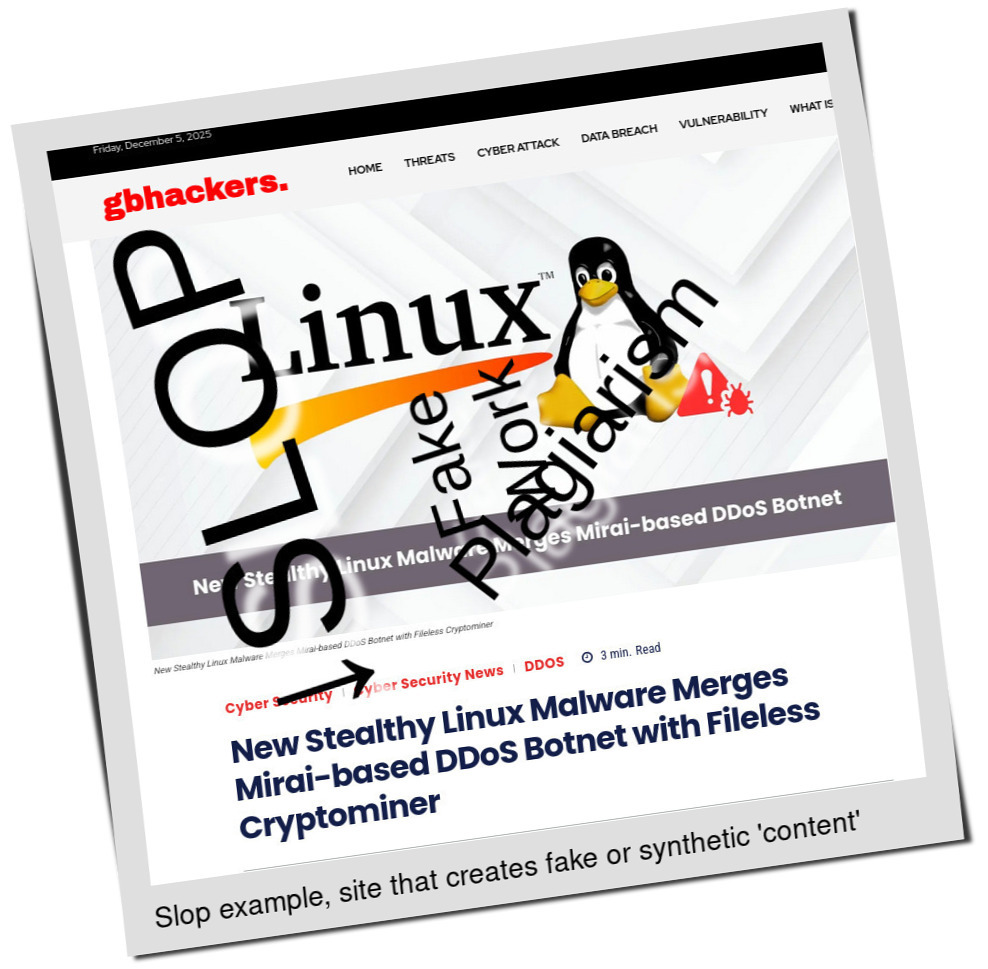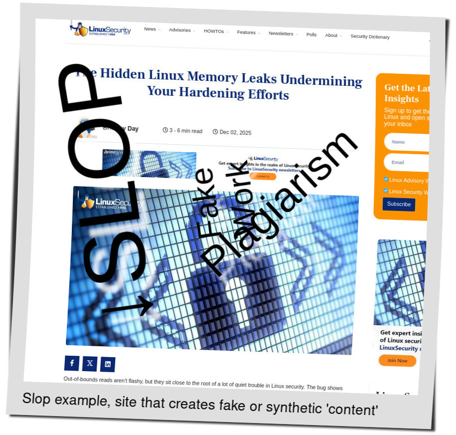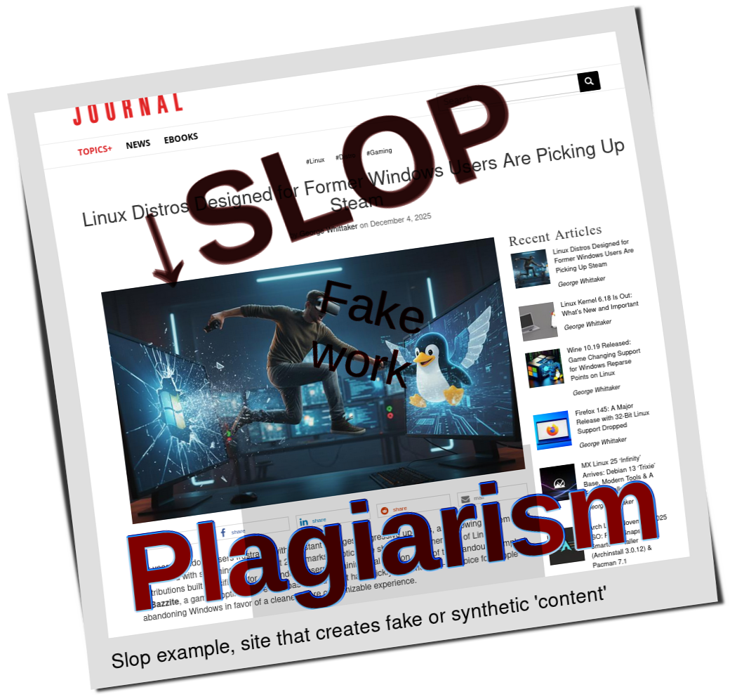 Google News got 'conned' (maybe willingly) by one operator of several (at least 3) slopfarms that trash "Linux" with LLM slop and fake images. Here's what one gets this afternoon from Google News: