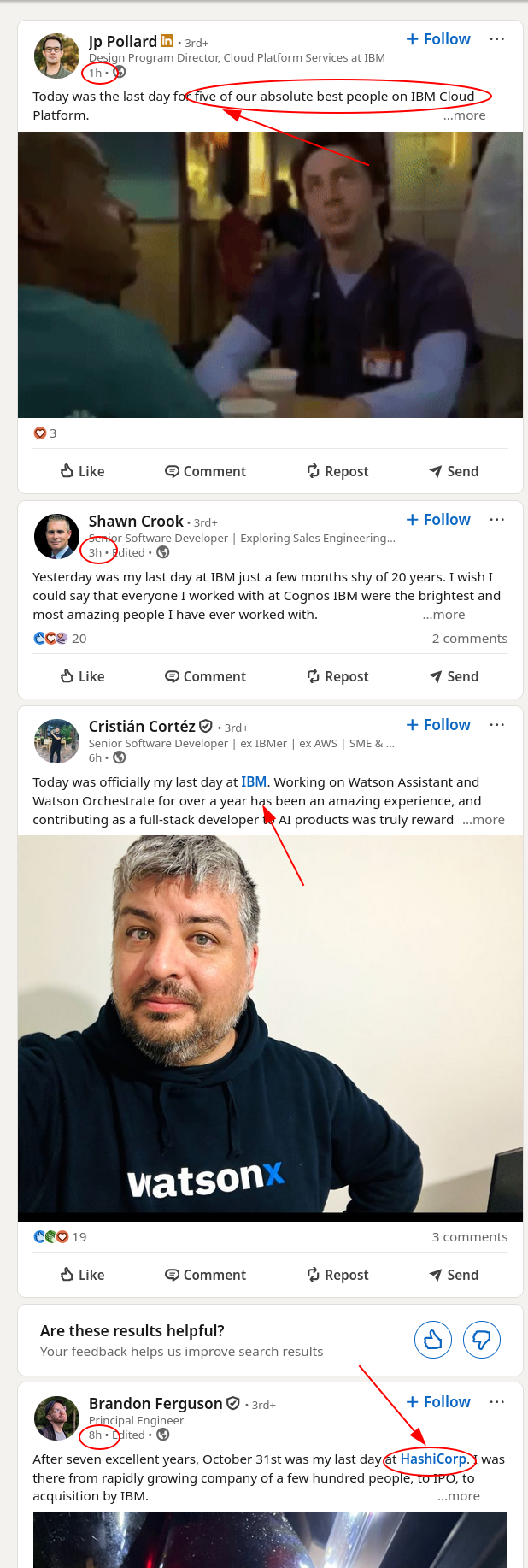 In the above screenshot (recent hours shown), the first pair of posts doesn't seem like a surprise. IBM is firing loads of people and it's not even done yet...
