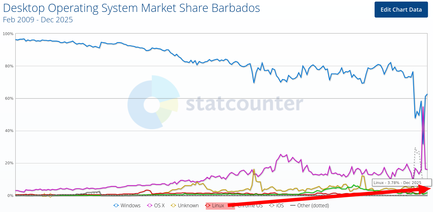 In Barbados, a decent-sized island, GNU/Linux made visible gains in recent years and this month it reaches about 4% or over 5% if one counts ChromeOS as well. █