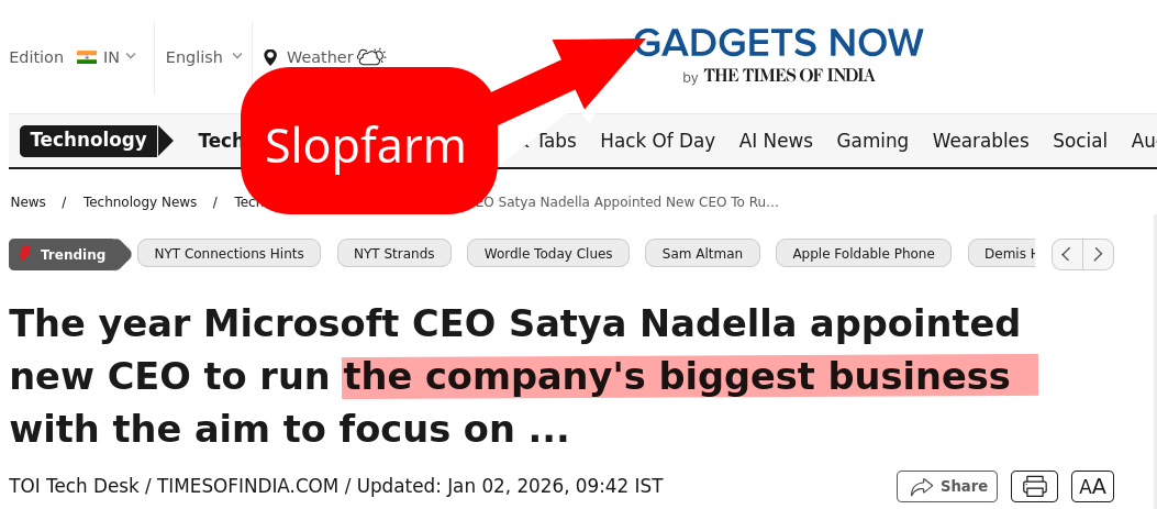 Once upon a time we linked to TOI quite a lot. About 1-2 years ago we began to notice that TOI had silently turned to LLMs. Apparently the salaries of journalists in India were too high, so TOI - reportedly in an existential crisis (financial problems) at the time - turned to slop. TOI still pretends to have a lot of output, but a lot of it is licensed (then reposted) from other sites and a lot of the rest is LLM slop.