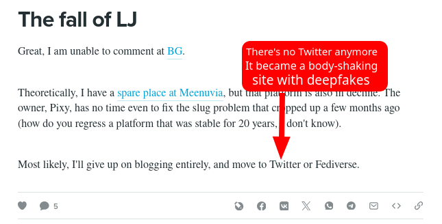 Hours ago we raised our brows, seeing that the eminent Cornelius Schumacher insinuated that slop may somehow put an end to the incentive to write (no, slop is waning right now!) and another eminent hacker (programmer) spoke of the demise of LiveJournal (LJ) as if it was a good reason to jump to the burning platforms, social control media (they're in a fast, unstoppable decline). The latter one mentioned Mastodon, which is a trap and a hive of trolls.
