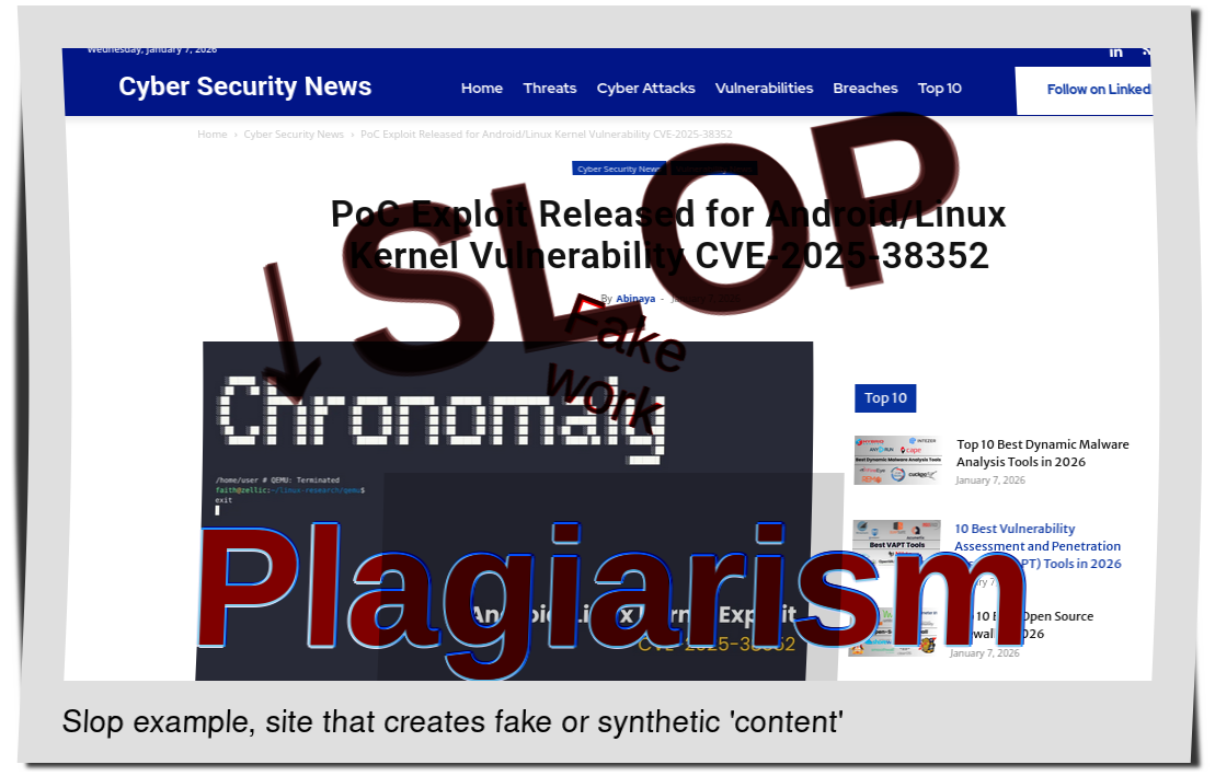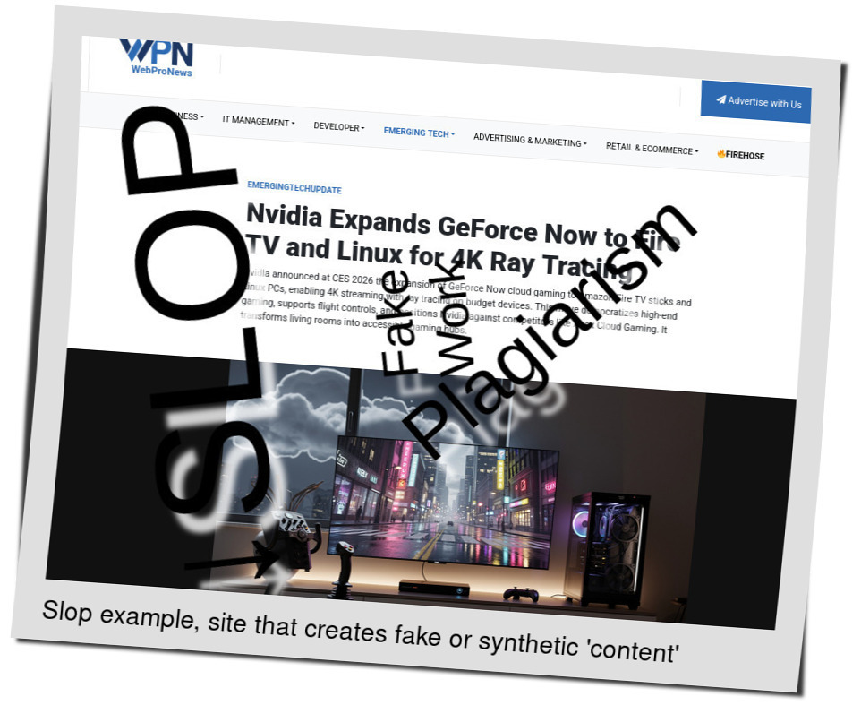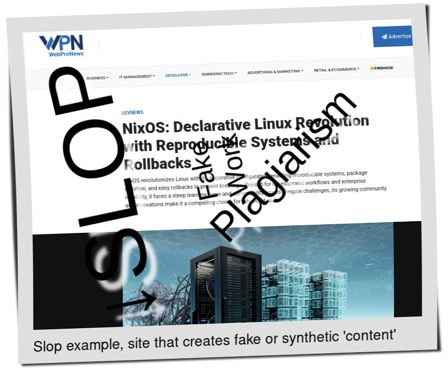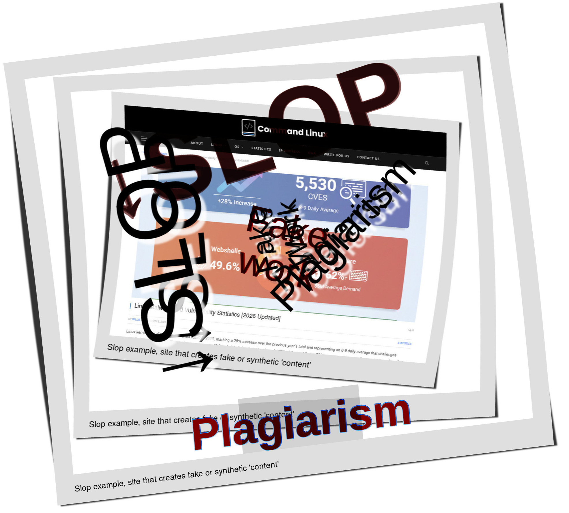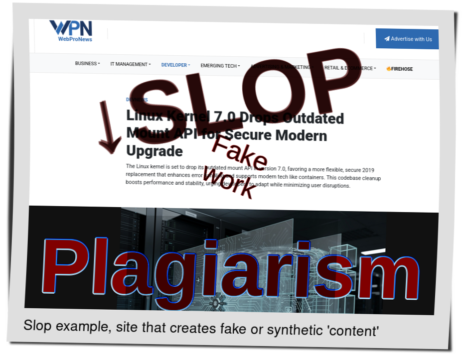 Slopwatch is dead, we've found not a single (none!) example of LLM slop about Linux in our RSS feeds, so below we show 2 days' worth of Google News spewing crap out about "Linux". Google News is actually promoting fake sites that are 100% slop, even the images!