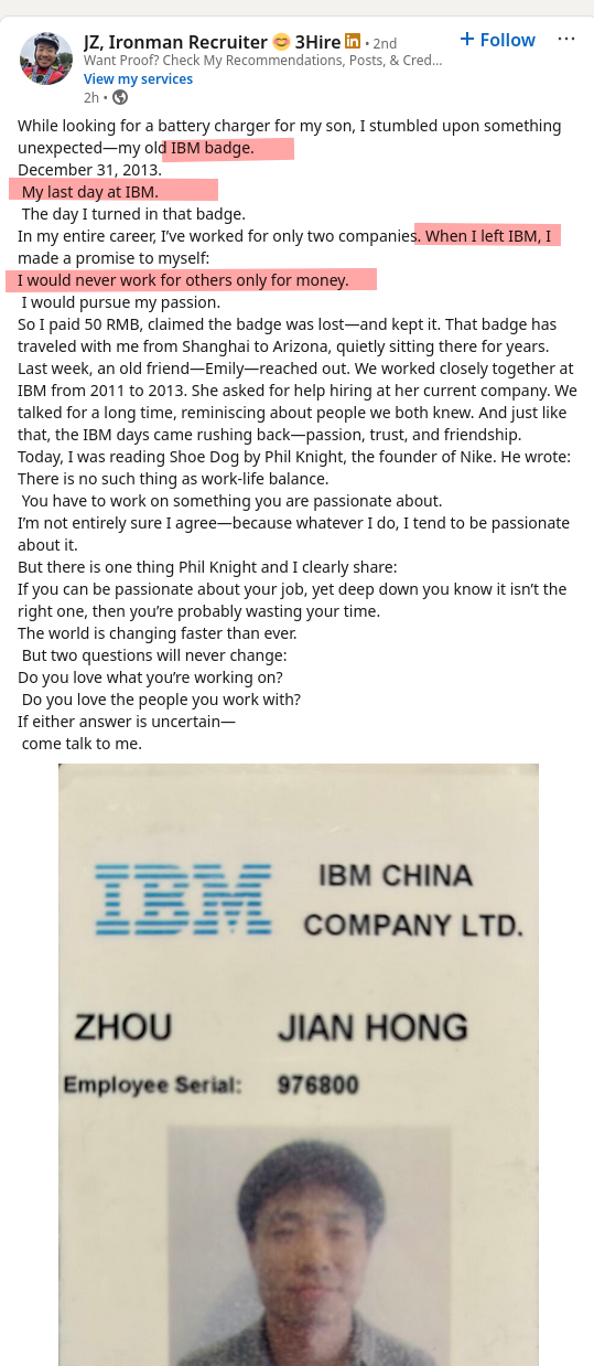 Hours ago a former IBMer from China explained what he learned about corporate loyalty: