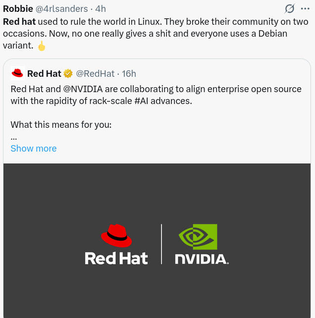This is what IBM turned Red Hat into. Red Hat will be as short-lived as the slop-wrangling bubble (calling everything "AI" to pretend it's new). They hire people for "AI" amid the bluewashing. What comes after that? A nonstop stream of "quantum" something something something from Red Hat? Remember what the CEO said to the mainstream media last year. █