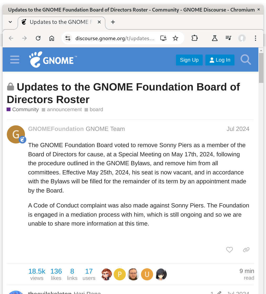 In 2024, the GNOME Foundation Discourse forum was used to publish a highly defamatory statement inciting people to attack Sonny and his family. Over 21,000 people looked at it so far.
