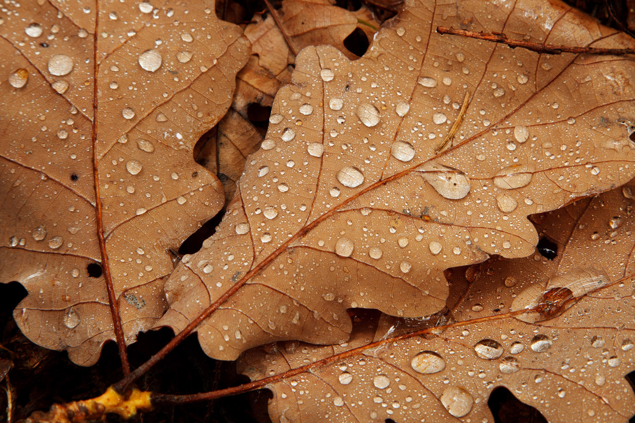 Water drops on brown dry oak leaves